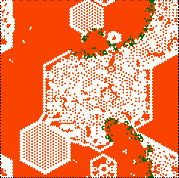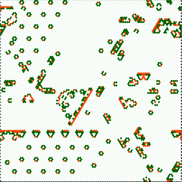 Below are "quick start" instructions for running the DD-Life and other complex CA shown above based on a k=6 hexagonal 2d lattice (i.e. each cell is connected to its 6 neighbors). Prompts, and responses to prompts, are shown in bold, the precise wording may vary. Backtrack with q. We start with the first (2 line) prompt of the main sequence of prompts when starting DDLab.